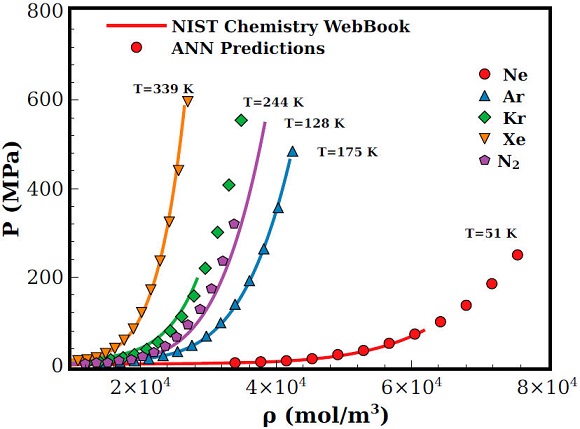 As one can see from Fig. 5, predictions shows a good overall agreement. However, for Kr, as the density is increased we can see an underestimation of the pressure. Nevertheless, such deviations can be due to the molecular parameters (σ and ϵ) used to represent Kr instead to the ANN predictions. Additionally and unfortunately we do not have experimental results at higher densities for Kr. In this regard, a better estimation of those molecular parameters could improve the ANN predictions, however, such task is out of the scope of this contribution. In any case, it is worth to stress the fact that even for densities where experimental pressure results are not reported, the predicted values by the ANN are sound physically meaningful. It means that the ANN could be used to predict such experimental values.
