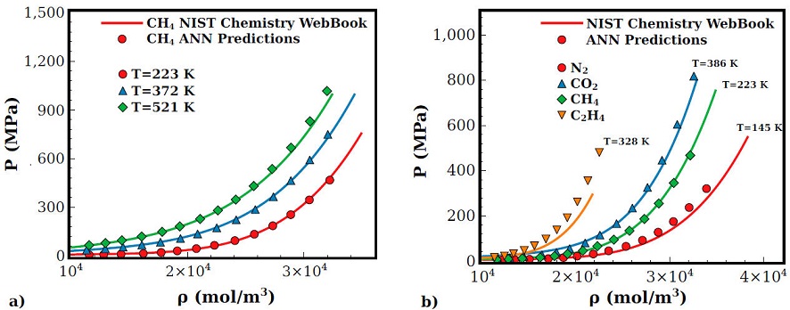 The prediction capabilities of the ANN are also tested against experimental results of some molecular liquids, like N2, CO2, CH4 and C2H4. In Fig. 6a) the pressure behaviour as a function of the density of CH4 for three isotherms is shown. As one can see the agreement is remarkably good, despite that at the highest densities and temperature certain deviations can be seen. Additionally, in Fig. 6b) results for different molecular liquids are also shown, in this scenario CO2 and CH4 are very well predicted but N2 and C2H4 are slightly overestimated, nevertheless, we remark the fact that the qualitative behaviour is well represented.