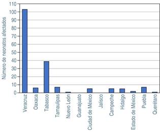 En México, esta alteración se encuentra en poblaciones costeras en virtud de la elevada proporción de personas afrodescendientes, donde la frecuencia de portadores es del orden de 10%, y uno de cada 400 RN tendrá la enfermedad.29-33 Estos reportes son consistentes con nuestro estudio, ya que Veracruz y Tabasco en conjunto representaron casi 80% de las hemoglobinopatías.7 Aunque los signos y síntomas pueden iniciar más allá del periodo neonatal, se recomienda que estos pacientes tengan seguimiento por un hematólogo.34-38