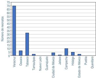 En cuanto a los pacientes con deficiencia de G6PD (n = 133), la mayoría se diagnosticó antes de los tres meses de vida (53.4%) (Tabla 2). Sólo 6% (n = 8) presentó manifestaciones clínicas. Al analizar la distribución geográfica, se observó que la mayor proporción eran originarios del estado de Veracruz (52.6%, n = 70), seguido de Tabasco (24%, n = 32) y Campeche (7.5%, n = 10) (Figura 2).
