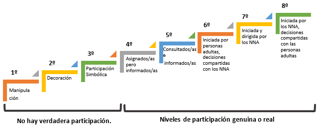 Por su parte, Hart (1993) presenta la Escalera de participación, un diagrama que plantea ocho niveles de participación, en el cual los tres primeros niveles son categorizados como “no hay participación” y los otros cinco restantes como “modelos de participación genuina o real”: 1) Manipulación, se trata de acciones con apariencia de participación de NNA, sin consultarles o darles a conocer la acción, solo actúan por intereses ajenos; 2) Decoración, que es la instrumentalización de NNA para decorar acciones o mostrar una buena imagen; 3) Participación simbólica, que aparenta que los NNA participan, pero los adultos/as son quienes eligen al NNA que mejor imagen proyecte; 4) Asignado pero informado, el cual busca la comprensión de los NNA sobre las acciones y su participación es voluntaria; 5) Consultados e informados, aquí los NNA tiene el rol de consultor para adultos/as que diseñan y dirigen las actividades; 6) Proyectos iniciados por los adultos/as, pero las decisiones son adoptadas con participación de los NNA; 7) Iniciados y dirigidos por los niños/as, un nivel donde las acciones son creadas y dirigidas por los NNA y 8) Proyectos iniciados por los niños/as, busca que las decisiones sean compartidas con los adultos/as respecto a proyectos iniciados por los NNA, obteniendo un proceso intergeneracional (pp. 5, 9-11 y 13-17).