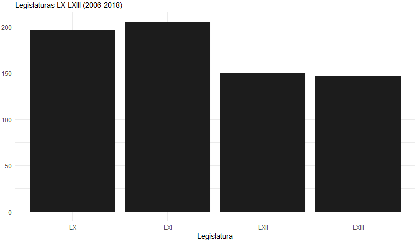 Al clasificar las iniciativas encontramos que en promedio los legisladores estuvieron vinculados a 174 grupos por legislatura. La legislatura con mayor número de diputados con membresías en grupos de presión fue la LXI con 205, mientras el periodo con el menor número de diputados con estos vínculos fue la legislatura LXIII con 147 grupos representados.