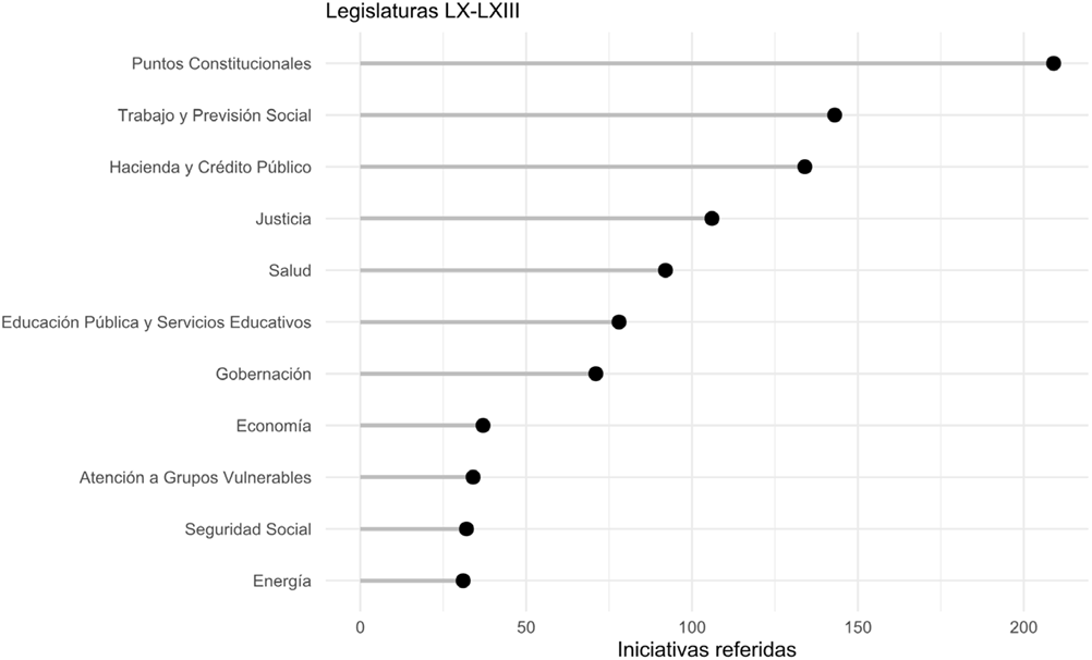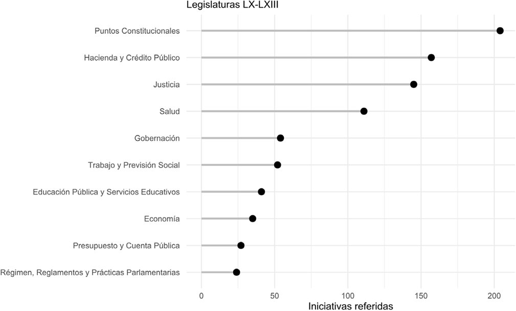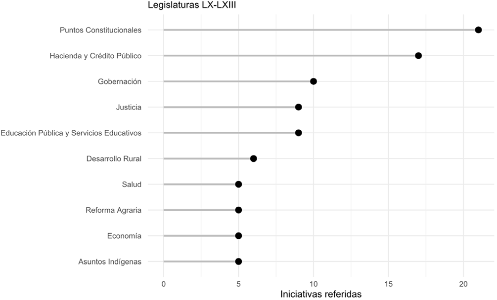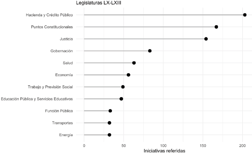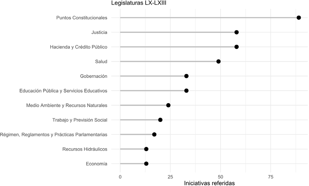 El mayor número de iniciativas presentadas por estos legisladores se dirigieron a las comisiones de Puntos Constitucionales (89), Justicia (58), Hacienda y Crédito Público (58) y Salud (49). En este gráfico podemos observar cómo la Comisión de Justicia es la de mayor importancia para estos grupos después de Puntos Constitucionales. Ahora, dentro de las propuestas de reforma constitucional se encuentran iniciativas en favor de la paridad de género, la imprescriptibilidad de los crímenes de lesa humanidad, la creación de tribunales ambientales, el reconocimiento al ingreso mínimo universal como derecho, entre muchos otros.