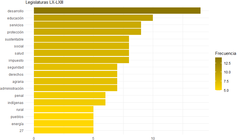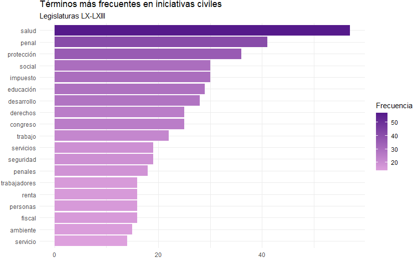 En estas iniciativas el término más frecuente es “salud” seguido de “penal”. Llama la atención que entre las palabras más utilizadas en estos proyectos destacan términos que no aparecen en el análisis de los grupos sindicales y empresariales como “derechos”, “personas” y “ambiente”; lo que sugiere que promueven una agenda distinta a los otros grupos. Al mismo tiempo, aparecen otros términos que son frecuentemente utilizados por grupos empresariales como “impuesto” y “fiscal”, así como palabras que son frecuentes en grupos sindicales como “trabajo” y “trabajadores”.