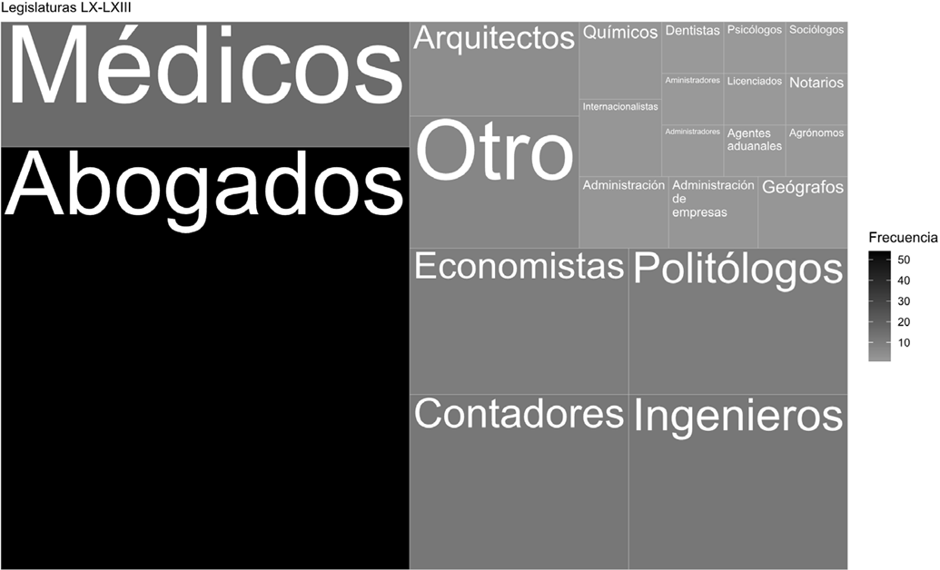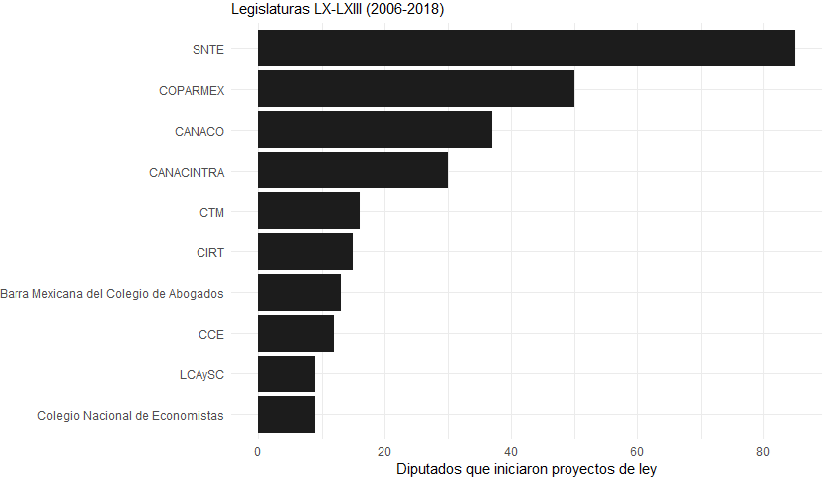Los grupos que se repiten con mayor frecuencia como antecedentes de los iniciadores de proyectos de ley incluyen membresías en la Barra Mexicana del Colegio de Abogados, el Colegio de Contadores Públicos, el Colegio Nacional de Economistas, el Colegio de Ciencias Jurídicas y la Asociación Mexicana de Cirugía Endoscópica.