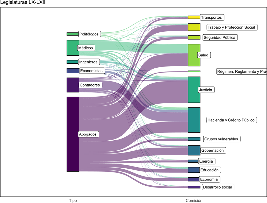 En cuanto al destino de las iniciativas presentadas por diputados vinculados a asociaciones profesionistas, mostramos que estos legisladores concentraron sus esfuerzos en las comisiones de Puntos Constitucionales, Hacienda y Crédito Público, Justicia y Salud. Los intereses representados por estos grupos son más heterogéneos en comparación con los grupos empresariales, sindicales, civiles y campesinos.