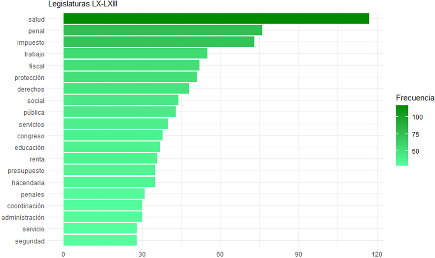 La mayoría de los proyectos de legisladores con membresías en asociaciones de contadores son turnados a la Comisión de Hacienda y Crédito Público. Mientras que las propuestas de los diputados con membresías en asociaciones de economistas son referidas, principalmente, a las comisiones de Hacienda y Crédito Público y Presupuesto y Cuenta Pública. Esta tendencia indica que las comisiones de referencia coinciden en gran medida con los temas de especialización de las asociaciones a las que pertenecen los diputados. La descripción de las iniciativas de diputados con membresías en asociaciones profesionistas, nos permite mostrar que la palabra más frecuente es “salud”. Otros dos términos recurrentes en tales descripciones son “penal” e “impuesto”.