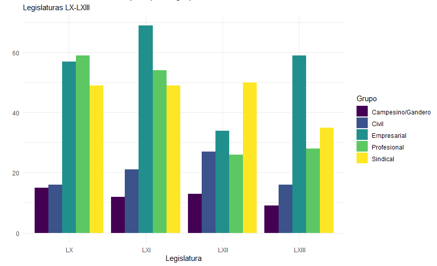 A diferencia de los estudios mencionados, que suelen centrarse en un solo tipo de grupo, la investigación de Solís y Cortez (2019) hace un análisis sistemático de los antecedentes de todos los miembros de la Cámara de Diputados. En su artículo exploran las afiliaciones de los diputados que formaron parte de tres legislaturas (2006-2015). Sus hallazgos comprueban que, en promedio, uno de cada cuatro legisladores cuenta con antecedentes en grupos como cámaras y asociaciones empresariales, sindicatos, asociaciones ganaderas y grupos civiles. Señalan, que los grupos empresariales tienen mayores probabilidades en el Partido Acción Nacional (PAN), el Partido Revolucionario Institucional (PRI) y el Partido Verde Ecologista de México (PVEM), mientras que los grupos civiles son más comunes en partidos de izquierda como el Partido de la Revolución Democrática (PRD). Por el contrario, encuentran un mayor pragmatismo en los grupos sindicales (Solís y Cortez, 2019).