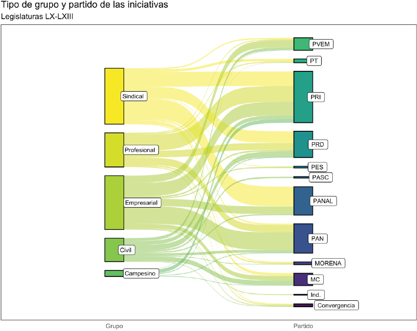 Este análisis considera únicamente a los diputados vinculados a grupos de presión que propusieron iniciativas de ley. El flujo de datos indica el volumen de iniciativas presentadas por cada tipo de grupo a través de los distintos partidos políticos. En primer lugar, se observa que los grupos con mayor número de iniciativas presentadas en este periodo fueron los sindicales, empresariales y las asociaciones de profesionistas, mientras que el grupo con menor número de iniciativas fue el campesino.