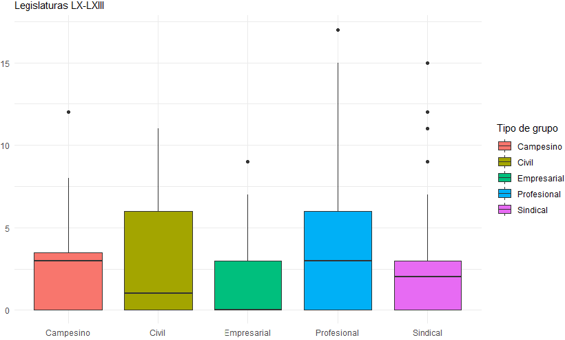 Una segunda dimensión analizada son los años de experiencia legislativa de los diputados con membresías en grupos de presión. El gráfico 5 muestra que la mediana de años de experiencia es más alta en tres grupos: campesinos, profesionales y sindicales. En contraste, la mediana es menor en grupos civiles y empresariales, con un valor de 0. Esto sugiere que las carreras legislativas de los diputados de grupos campesinos, profesionales y sindicales tienden a ser más largas que las de los grupos empresariales. Esta diferencia es relevante, ya que podríamos esperar que legisladores con mayor experiencia y conocimiento del proceso legislativo sean actores más exitosos en el Congreso.