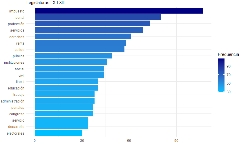 Al depurar la base de términos poco informativos, mostramos que la palabra más frecuente en estas iniciativas es “impuesto”. Además, entre los términos más utilizados aparecen algunas palabras relacionadas con el tema de recaudación de impuestos como “fiscal” y “renta”. Por otro lado, estos legisladores también hacen frecuente referencia a los términos “penal” y “penales”, que coincide con la alta concentración de iniciativas en la Comisión de Justicia. Asimismo, estos grupos suelen estar preocupados por temas como el crecimiento económico y la competitividad, entre los términos frecuentes puede observarse algunas palabras relacionadas con la agenda promovida por estos grupos como “desarrollo” y “servicios”.