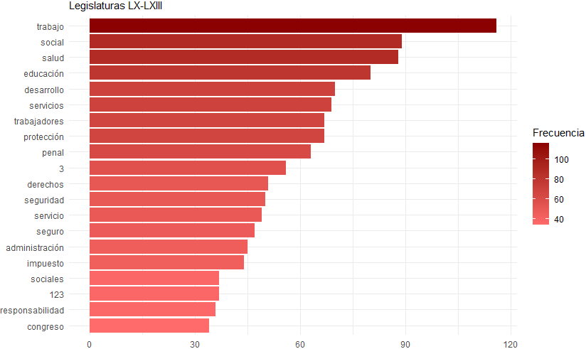 En el análisis de la descripción de las iniciativas de los diputados con antecedentes sindicales el término más frecuente es trabajo. Dentro de los términos frecuentes para describir estas iniciativas se observan términos como “social”,” sociales”, “salud”, “trabajadores”, “protección”, “derechos”, “seguridad” y “123”. Todos ellos términos que están relacionados con la agenda de defensa de derechos sociales de los trabajadores.