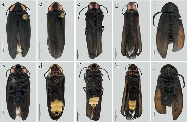 Figura 2 Hábito dorsal y ventral. a), b) Photinus albolimbatus Gemminger, 1870. c), d) P. extensus Gorham, 1881. e), f) P. palaciosi (Zaragoza-Caballero, 2012). g), h) P. totiwi sp. nov. i), j) P. ximutiwi sp. nov.