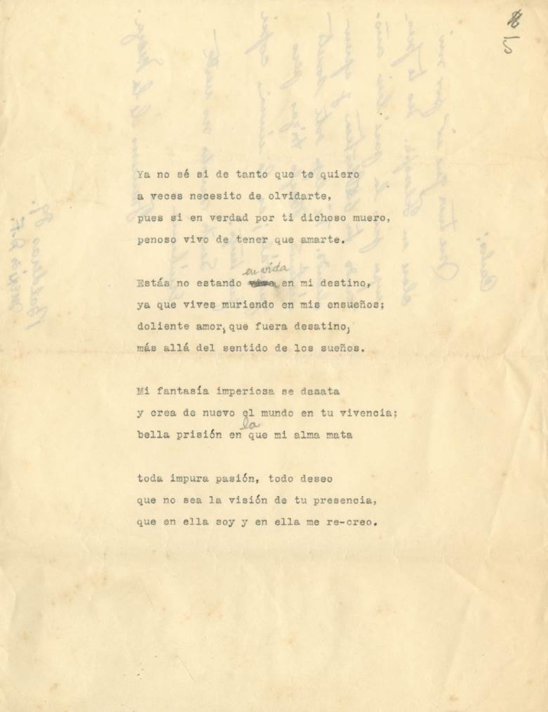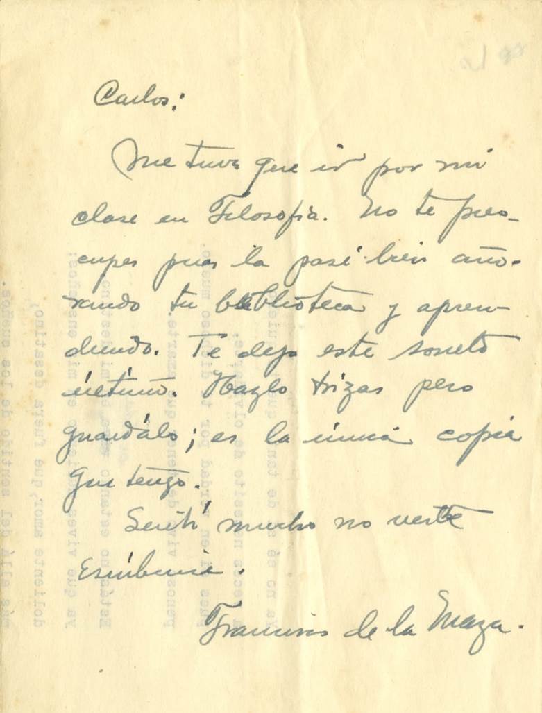 Son dos las últimas cartas del historiador del arte dirigidas a Pellicer, que se conservan en el acervo de la biblioteca del poeta. Una es breve y fue dejada por el historiador, ya que no encontró al poeta en casa (fig. 9). Carece de fecha, pero tiene una dirección (Balderas 89) abajo, que sería del historiador (¿?). Con la carta, De la Maza dejó el texto de un soneto suyo (fig. 10), escrito a máquina, pero con correcciones mínimas a pluma. En su carta le pide al poeta que guarde el soneto porque “es la única copia que tengo”. Legible en la fotografía, el soneto es un mensaje amoroso, de despedida y reencuentro.