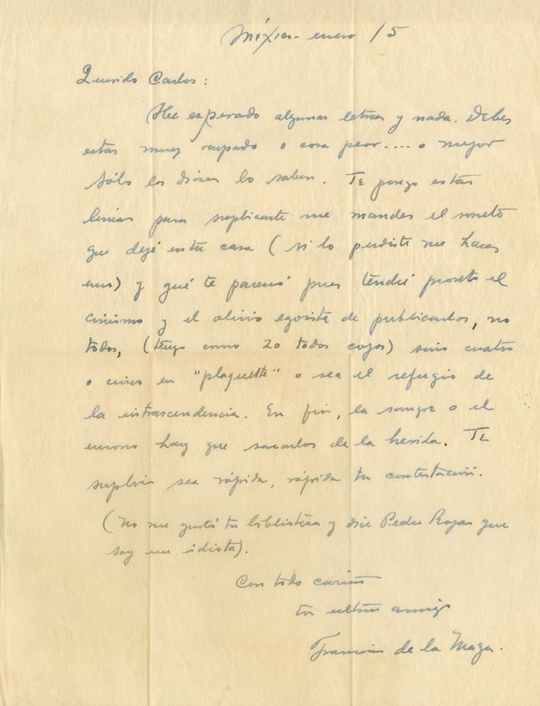 12 Nota de Francisco de la Maza, 14 de mayo de 1965. Biblioteca Nacional, Archivo Carlos Pellicer, UNAM.