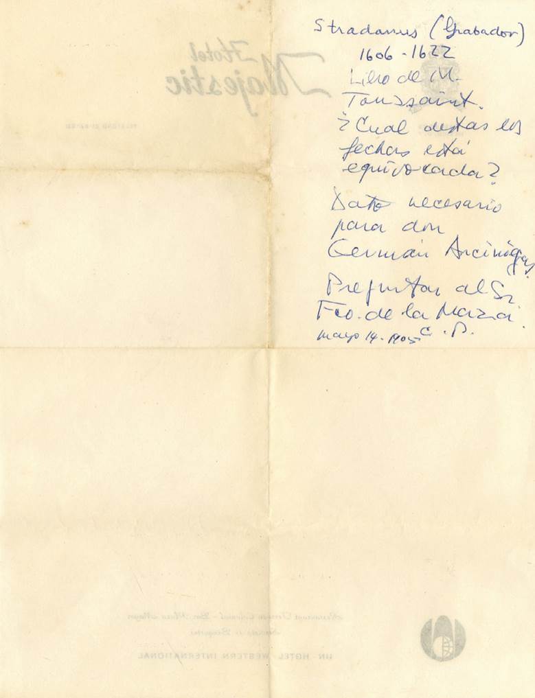 Una última carta del historiador para el poeta está fechada el 15 de enero, sin año (fig. 11). Es un mensaje con elementos de humor y algo de resentimiento (“no me gustó tu biblioteca y dice Pedro Rojas que soy un idiota”), pero termina “con todo cariño, tu último amigo”. Existe, además, un pequeño papel manuscrito de Pellicer (fig. 12) con una referencia al primer grabador en metal conocido de la Nueva España, quien trabajó en la Ciudad de México a principios del siglo XVII, Samuel Stradanus: “dato necesario para don Germán Arciniegas, preguntar al Sr. Francisco de la Maza. Mayo 14 1965. C. P.”.