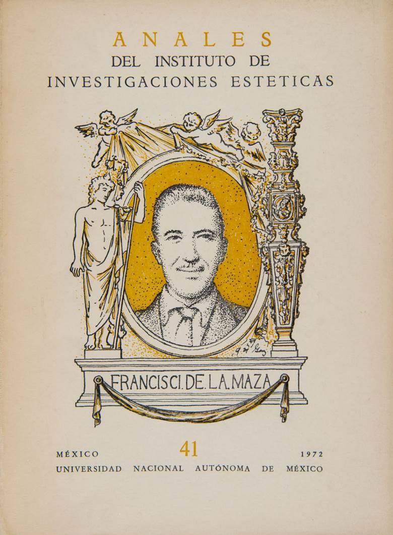 Cierro este texto con una imagen de Francisco de la Maza, como es apropiado para una publicación acerca de un historiador del arte. Se trata de la portada del número 41 de Anales del Instituto de Investigaciones Estéticas (fig. 13) en la que se ve un dibujo del rostro sonriente del historiador, recién fallecido el 7 de febrero de 1972. Lo que cualquier historiador del arte puede reconocer es que la fuente de inspiración del dibujo son ni más ni menos que las páginas titulares del famosísimo libro de Giorgio Vasari en el que registra las vidas de los artistas renombrados de su tiempo y de siglos anteriores: Le vite dei piu’ eccellenti architetti, pittori et scultori italiani, da Cimabue infino a’ tempi nostri, de 1550. Tal como lo hizo Vasari con sus antecesores y colegas artistas, el diseñador de la portada de Anales enmarcó el rostro de De la Maza entre dos imágenes alusivas a sus pasiones e intereses: la figura de Antinoo, el joven amado del emperador Adriano, y una pilastra estípite.