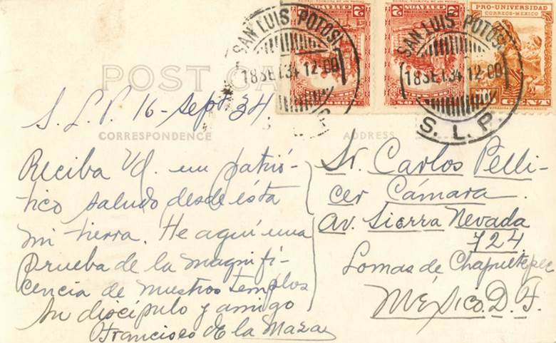 El primer documento que presento es una postal enviada por Francisco de la Maza a Pellicer el 16 de septiembre de 1934 (figs. 1a y b), firmada “Francisco de la Maza su discípulo y amigo”. Se trata de una fotografía en blanco y negro del interior de la iglesia del Carmen de San Luis Potosí, ciudad natal del historiador, con el comentario: “He aquí una prueba de la magnificencia de nuestros templos”. Parece tratarse de la continuación, o de recuerdos, de conversaciones que, con seguridad, tuvieron. Pellicer había pasado un periodo bastante largo en Europa y había escrito cartas, ahora publicadas, en las que expresaba su maravilla al conocer las obras de arte en Italia.3 De la Maza, futuro miembro del Instituto de Investigaciones Estéticas de la UNAM, estaba conociendo y dando a conocer el arte no sólo de su ciudad de origen, sino de otros lugares virreinales de México, muchos de ellos alejados del centro del país. No despreciaba para nada el arte europeo, pero su misión principal era otra: conocer y valorar el patrimonio artístico de México.