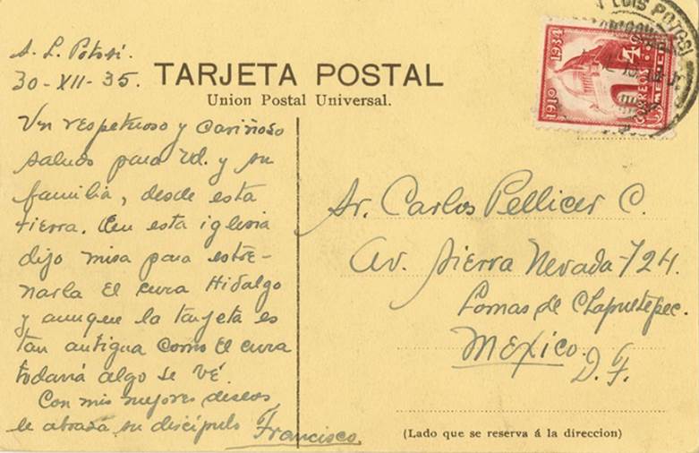 2 Postal de Francisco de la Maza a Carlos Pellicer, Santuario de Guadalupe de San Luis Potosí, 30 de diciembre de 1935. Biblioteca Nacional, Archivo Carlos Pellicer, UNAM.