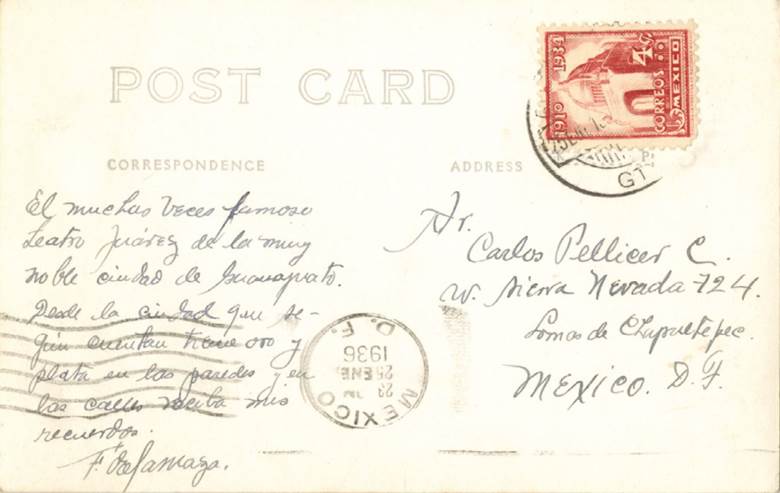 3 Postal de Francisco de la Maza (anverso), 23 de enero de 1936. Biblioteca Nacional, Archivo Carlos Pellicer, UNAM.