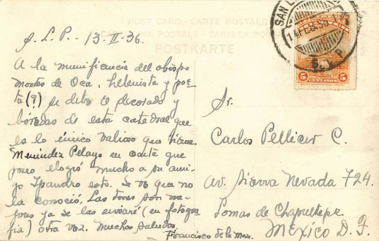 4 Postal de Francisco de la Maza a Carlos Pellicer, Catedral de San Luis Potosí, 13 de febrero de 1936. Biblioteca Nacional, Archivo Carlos Pellicer, UNAM.