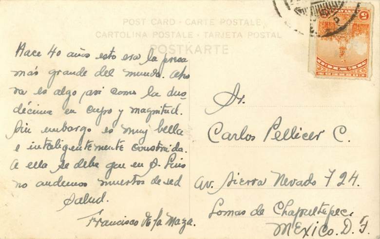 5 Postal de Francisco de la Maza a Carlos Pellicer, Presa de San José. Biblioteca Nacional, Archivo Carlos Pellicer, UNAM