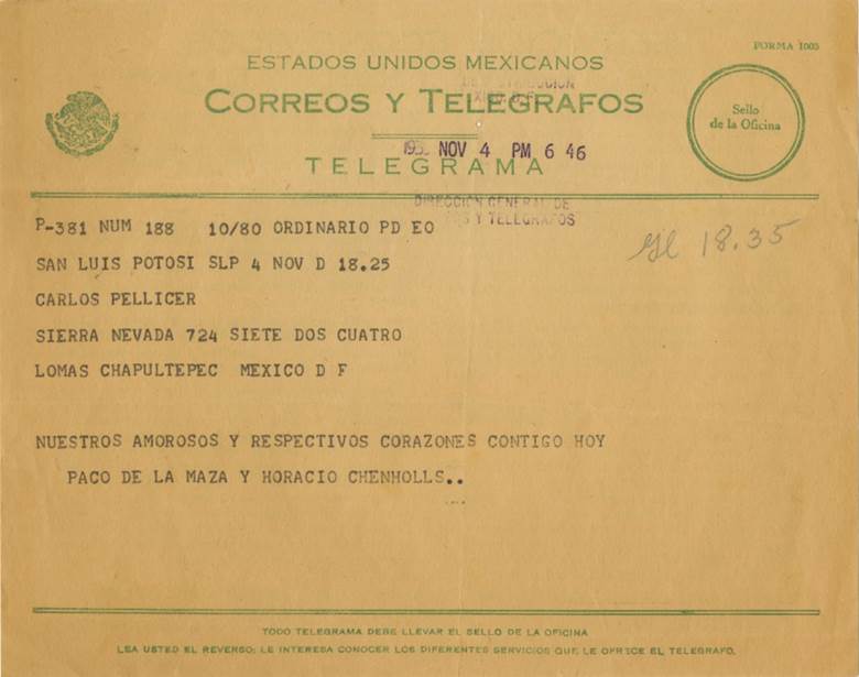 6 Telegrama de Francisco de la Maza y Horacio Chenhalls (sic), 4 de noviembre de 1946. Biblioteca Nacional, Archivo Carlos Pellicer, UNAM.
