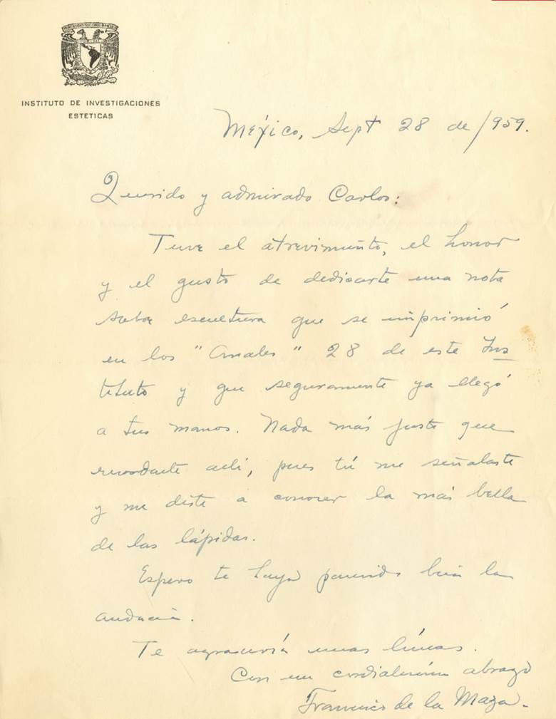7 Carta de Francisco de la Maza, 28 de septiembre de 1959. Biblioteca Nacional, Archivo Carlos Pellicer, UNAM.