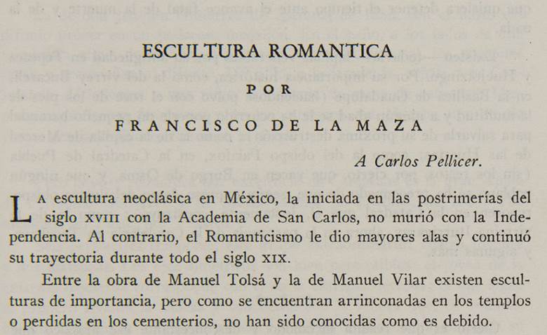 No hace falta abundar en detalles acerca de la cantidad y la variedad de los escritos de De la Maza y de su empeño en registrar, estudiar y hacer lo posible para salvaguardar el patrimonio artístico de México. Con razón, se le identifica más que nada con las áreas de artes virreinales y decimonónicas. Por mi parte, debo confesar que, al llegar a México en 1972, no podía dejar de maravillarme frente a todo lo que había que estudiar acerca del arte en México, cuya existencia me era casi del todo desconocida, a pesar de los años que ya tenía de estudiar, leer y publicar acerca de temas de historia del arte en Italia y en Estados Unidos. Mi nueva vida en México no fue sólo un nuevo camino personal; también me abrió un “nuevo mundo” de conocimientos al que podía contribuir con las enseñanzas y prácticas que había adquirido en mis estudios y viajes anteriores. La ocasión del presente coloquio en honor a De la Maza no sólo me recordó mis primeros tiempos en México. De igual manera, me animó a volver a los papeles de Pellicer -con la invaluable ayuda de su sobrino, Carlos Pellicer López. Mis hallazgos acerca de De la Maza, relacionados con Pellicer -aunque no muchos-, añaden algo a las historias tanto del historiador del arte como del poeta, así que me ha parecido apropiado compartirlos en esta ocasión.