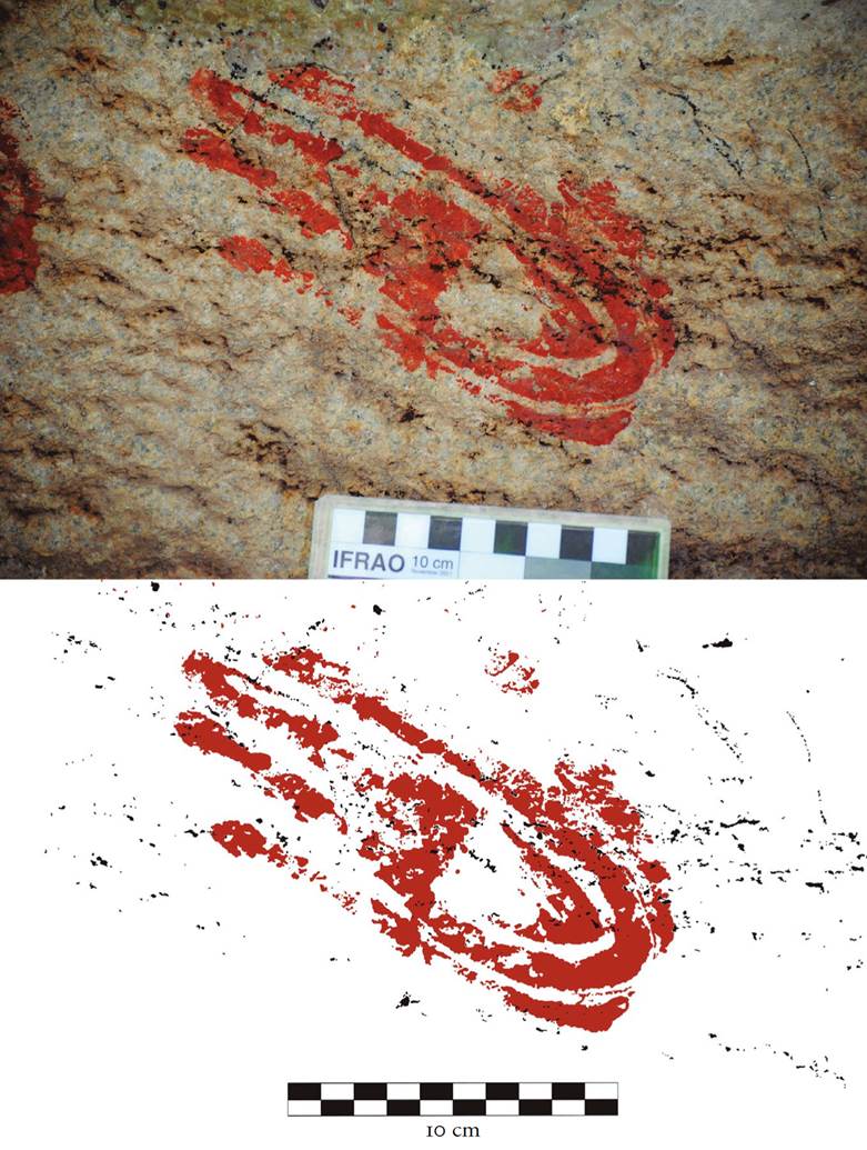 Los procesos de ejecución de estas obras, cuya importancia se ha hecho patente con lo descrito referente al uso del color, es también un aspecto referencial para esta tradición. Y es que una constante a lo largo de todos los sitios que la conforman es el empleo preponderante de los dedos o de las palmas de la mano en su realización; no obstante, se documenta en unos pocos motivos la utilización igualmente de pinceles.8 Se está pues ante un lenguaje pictórico de claro trasfondo gestual que exhibe la enorme necesidad de sus autores de tener contacto con la roca y en el que la propia materialidad de la pintura probablemente sirve como un intermediador y potenciador de este acto. Es en virtud de esta evidencia que se ha podido reconocer cómo los gestos que están involucrados en la creación de las imágenes forman parte de un complejo fenómeno de comunicación e interrelación entre los individuos, la roca y las entidades que parecen estar contenidas en esta última, parte de lo cual se expondrá en las siguientes páginas. Se trataría, finalmente, de obras cuya función y significación se da, en esencia, frente a la posibilidad de que éstas puedan ser vivenciadas y experimentadas a lo largo de su proceso de creación artístico, de tal forma que el resultado pictórico-material de tales actividades puede pasar a segundo término.9