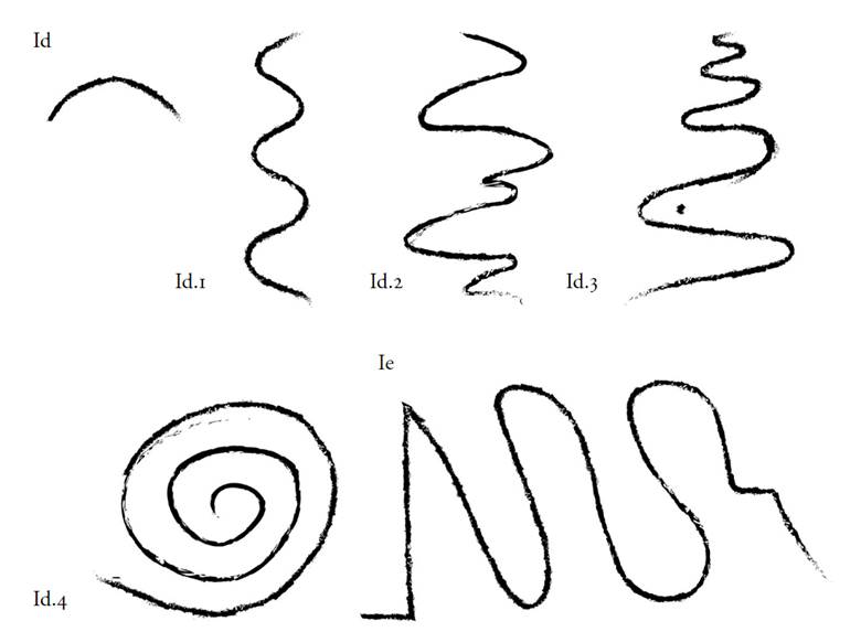 10 Formas elementales en la pintura: (Id) líneas curvas; (Id.1) geométricamente ondulada; (Id.2) libremente ondulada; (Id.3) combinada; (Id.4) regularmente desviada y (Ie) línea mixta. Dibujos: Daniel Herrera Maldonado.