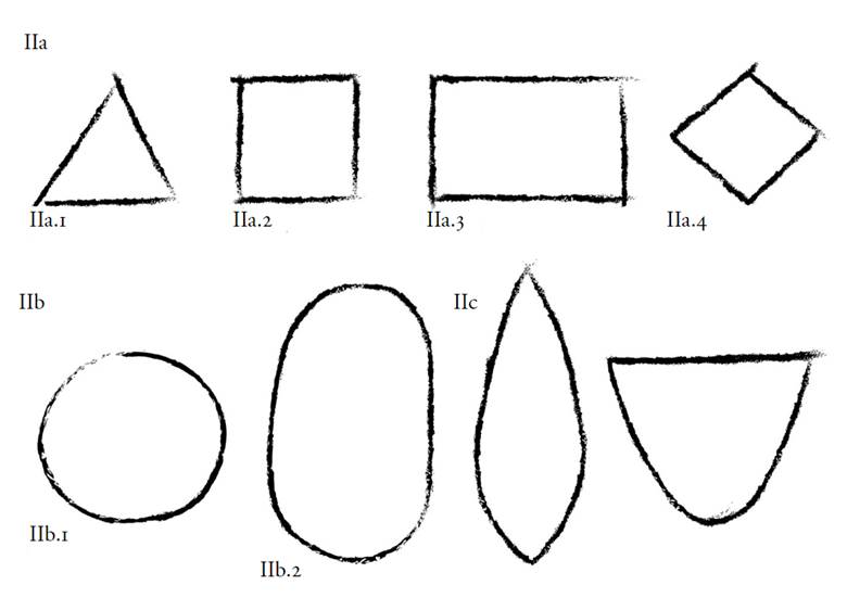 11 Planos elementales. Derivados de las líneas rectas (IIa): (IIa.1) el triángulo; (IIa.2) el cuadrado; (IIa.3) el rectángulo y (IIa.4) el rombo. Derivados de la curva (IIb): (IIb.1) el círculo; (IIb.2) el óvalo o elipse y (IIc) planos mixtos. Dibujos: Daniel Herrera Maldonado