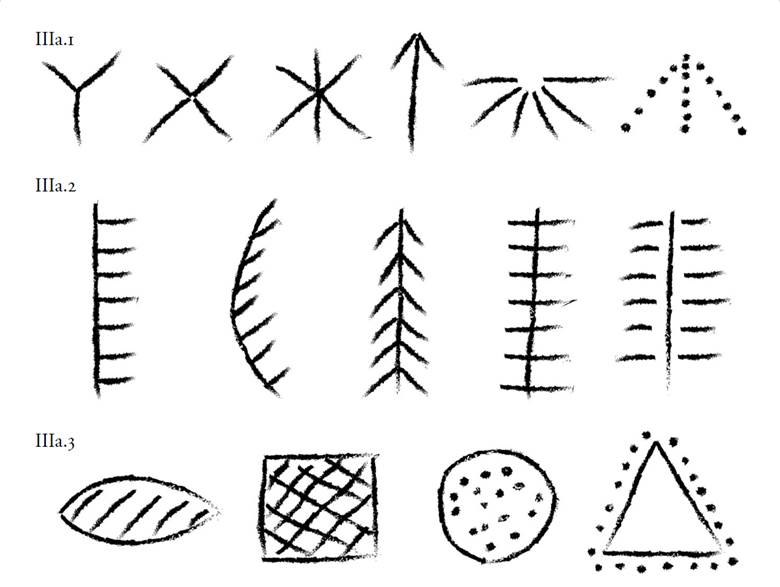 Para comenzar se introducirá al lector en los atributos estilísticos que mejor distinguen la tradición pictórica de la que se originan los motivos que son el centro de esta investigación. Sin duda uno de los principales es el que refiere al sentido de abstracción de sus imágenes, que se expresa en una marcada predisposición a la descomposición de sus formas a sus elementos esenciales: puntos, líneas y planos (fig. 5). En algunos pocos casos se reconoce la posibilidad de que los elementos gráficos sean producto de la esquematización de una forma naturalista, por ejemplo, la figuración de lo que podría ser un animal, planta, cuerpo celeste o una punta de proyectil, pero ante la clara tendencia hacia la abstracción de la tradición, seguramente su referencia a estos objetos sirve como metáfora o metonimia a conceptos que van más allá de la sola aspiración a la representación esquemática de la naturaleza. Es en virtud de esto que se afirma que se está frente a un estilo artístico con una patente negación de todo rasgo de realismo en el diseño de las figuras.