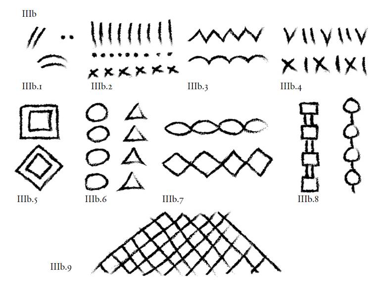 En consecuencia, su repertorio gráfico se encuentra integrado, en términos generales, en lo que se ha clasificado como cuatro grandes familias: la de los elementos lineales (que emplea trazos rectos, zigzagueantes y ondulantes), los puntos, los planos circulares/ovales y los signos impresos con las manos. Si bien es cierto podría concluirse, en un primer momento, en el aspecto poco diverso y muy circunscrito del repertorio de elementos gráficos que se utilizan, considérese también que puede presentarse una variabilidad al interior de estos grupos que está en proceso de definición. Esto último se hace notar especialmente en la primera familia mencionada, la de mayor representatividad cuantitativa en los sitios, al conformar signos de los llamados compuestos,4 es decir, que combinan varios elementos.