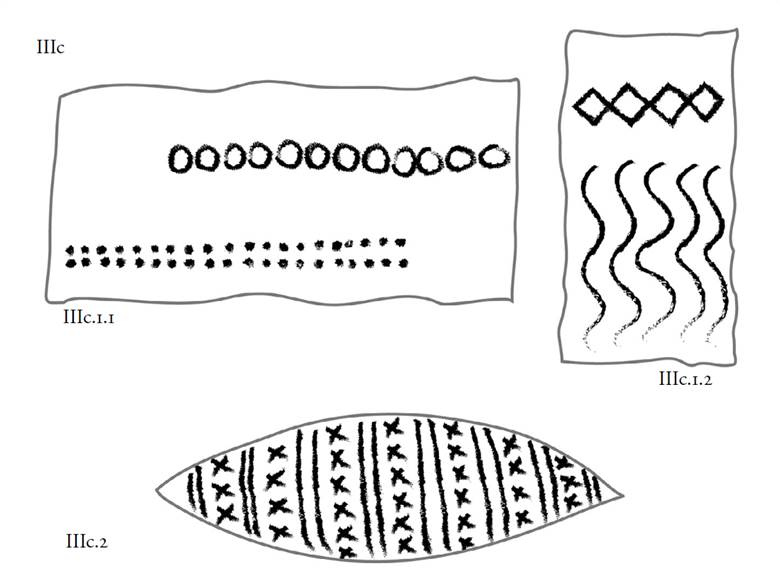 Esta forma básica presenta ciertas variaciones a partir de la inclusión de nuevos elementos gráficos. Por ejemplo, en una de éstas, tres es el número de curvas que se ordenan alineadas en secuencia rítmica (fig. 16: 1d). En otra, la centralidad de la palma de la mano la ocupa un plano oval, alrededor del cual se “agregan” de una a tres curvas simples en paralelo (fig. 16: 1b, 1c y 1e).