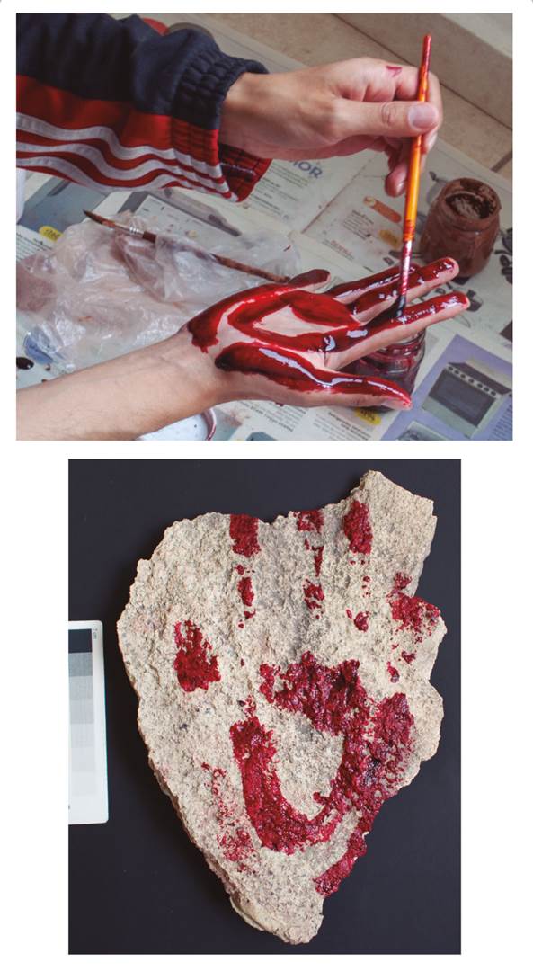 15 Reproducción experimental de los signos compuestos impresos con la mano de Cueva de Galindo. Su primera fase de elaboración implica bosquejar sobre la palma los diseños (arriba), para que posteriormente se impriman en el soporte rocoso (abajo). Fotos: Ana Laura Chacón Rosas.