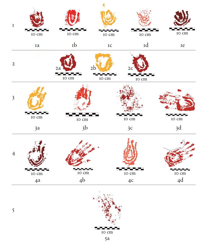 16 Clasificación de las cinco variantes de la familia gráfica de los signos compuestos impresos con la mano. Cueva de Galindo, Cañón de Molino. Dibujos: Daniel Herrera Maldonado.