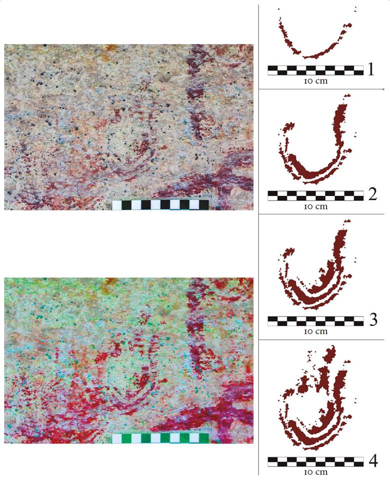 17 Proceso de articulación en cuatro fases o momentos del motivo III-28, Cueva de Galindo, Cañón de Molino. Imagen inferior modificada con DStretch YRD. Fotos y dibujos: Daniel Herrera Maldonado.
