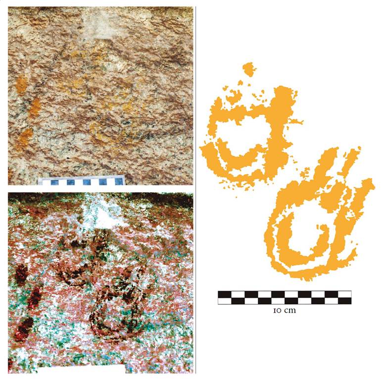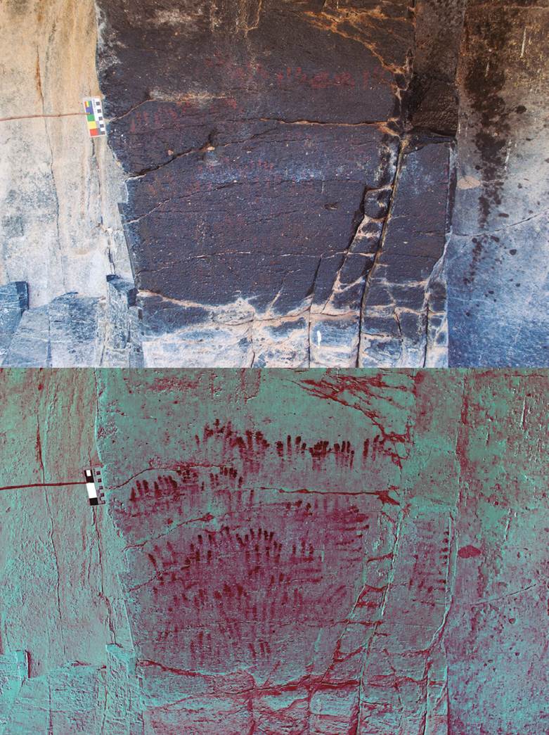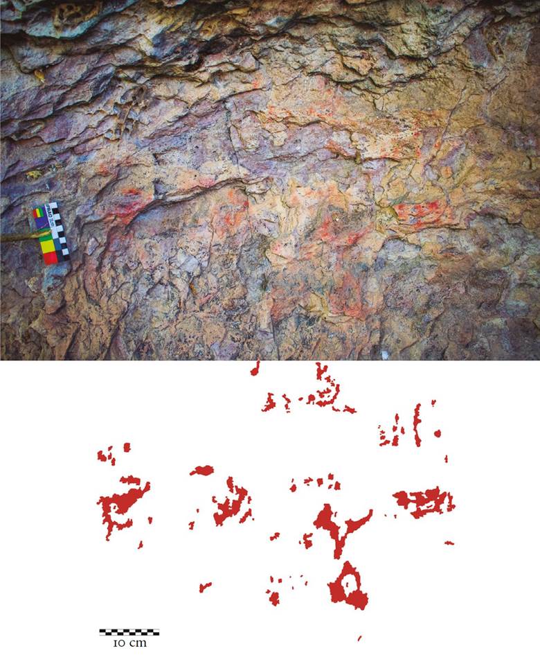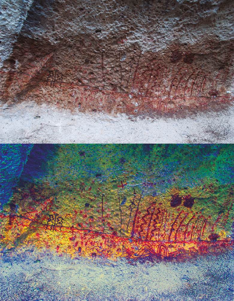 18 Signos compuestos impresos con la mano, motivos III-10 y III-11. Cueva de Galindo, Cañón de Molino. Imagen inferior modificada con DStretch LYE. Foto y dibujos: Daniel Herrera Maldonado.