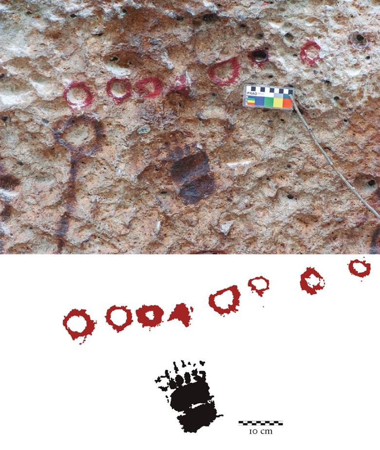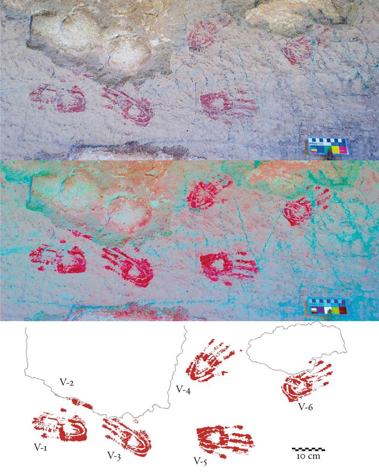 25 Signos impresos con la mano de Cueva de la Garza, cuenca superior del río Humaya. Foto y dibujo: Daniel Herrera Maldonado.