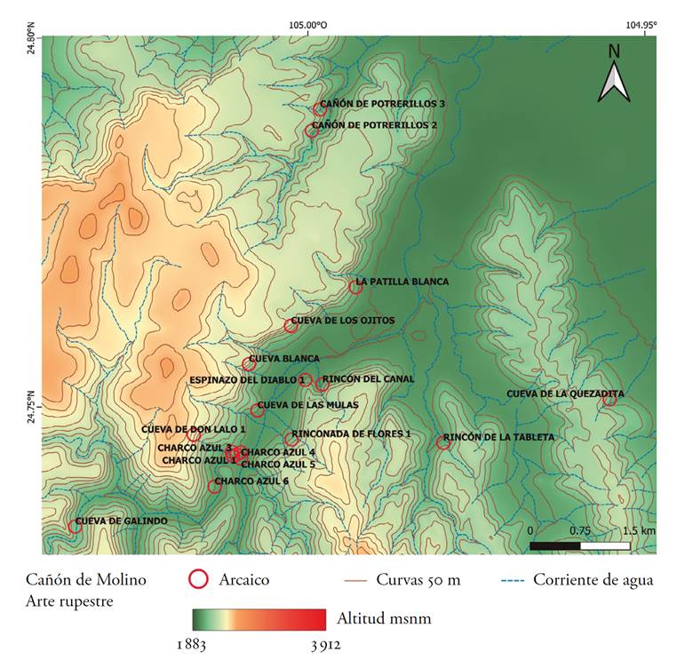 2 Mapa del Cañón de Molino y sus áreas adyacentes con la distribución de sitios de arte rupestre de la Tradición Pictórica del Arcaico. Cuenca de la Laguna de Santiaguillo. Elaboración: Ana Laura Chacón Rosas y Daniel Herrera Maldonado.