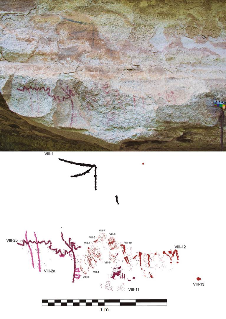La centralidad que tiene el panel V parece subrayar, asimismo, la importancia de la convención ya descrita que lleva a la asociación, al mismo tiempo, de las secuencias de puntos, los signos compuestos impresos con las manos y los motivos lineales (fig. 8). Esta última familia gráfica incluye de manera repetida a las quebradas complejas o líneas mixtas que pueden tener una articulación zigzagueante. La convención entre estas tres familias gráficas se expresa en al menos cuatro ocasiones dentro de los paneles II, III, IV y V, pero se puede considerar que en prácticamente todas las veces que se plasman los signos impresos se da esta conjugación si contemplamos que en el panel VIII también se pintan puntos aunque no se disponen en secuencia. Es por esa razón que se afirma el carácter tan distintivo de esta tríada temática para Cueva de Galindo.