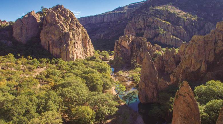 22 Charco Azul con sus altos monolitos rocosos que vigilan la entrada hacia el interior del cañón y la Cueva de Galindo. Foto: Daniel Herrera.