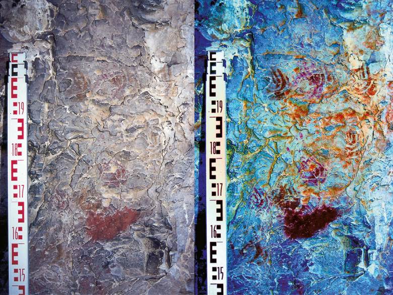 24 Signos impresos con la mano de La Contra Yerba, valle del río Zape. Imagen derecha modificada con DStretch LRD. Foto: Marie-Areti Hers.