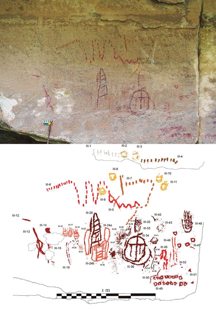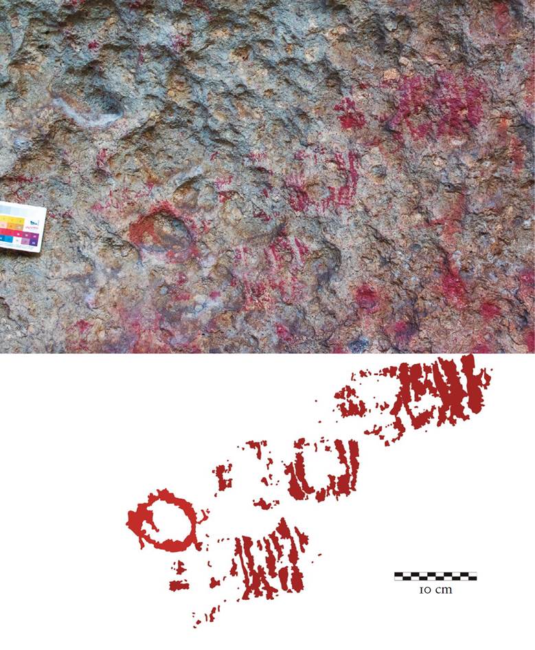 1 Signo compuesto impreso con la mano, número V-3, Cueva de Galindo, Cañón de Molino. Foto y dibujo: Daniel Herrera Maldonado.