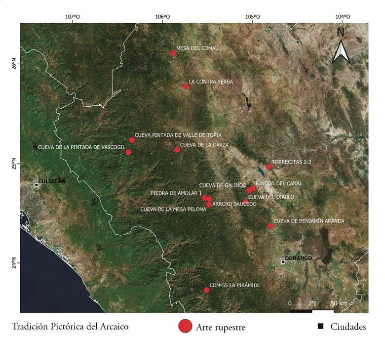 3 Mapa con la distribución de sitios de la Tradición Pictórica del Arcaico en el estado de Durango. Elaboración: Daniel Herrera Maldonado.
