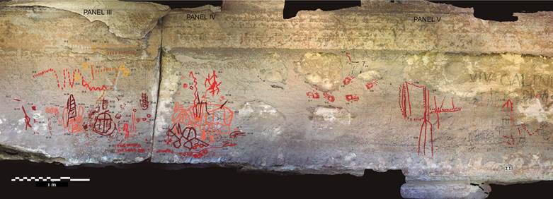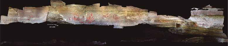 19 Conjunto de signos compuestos impresos con la mano. Panel V, Cueva de Galindo, Cañón de Molino. Imagen central modificada con DStretch LRE. Foto y dibujo: Daniel Herrera Maldonado.