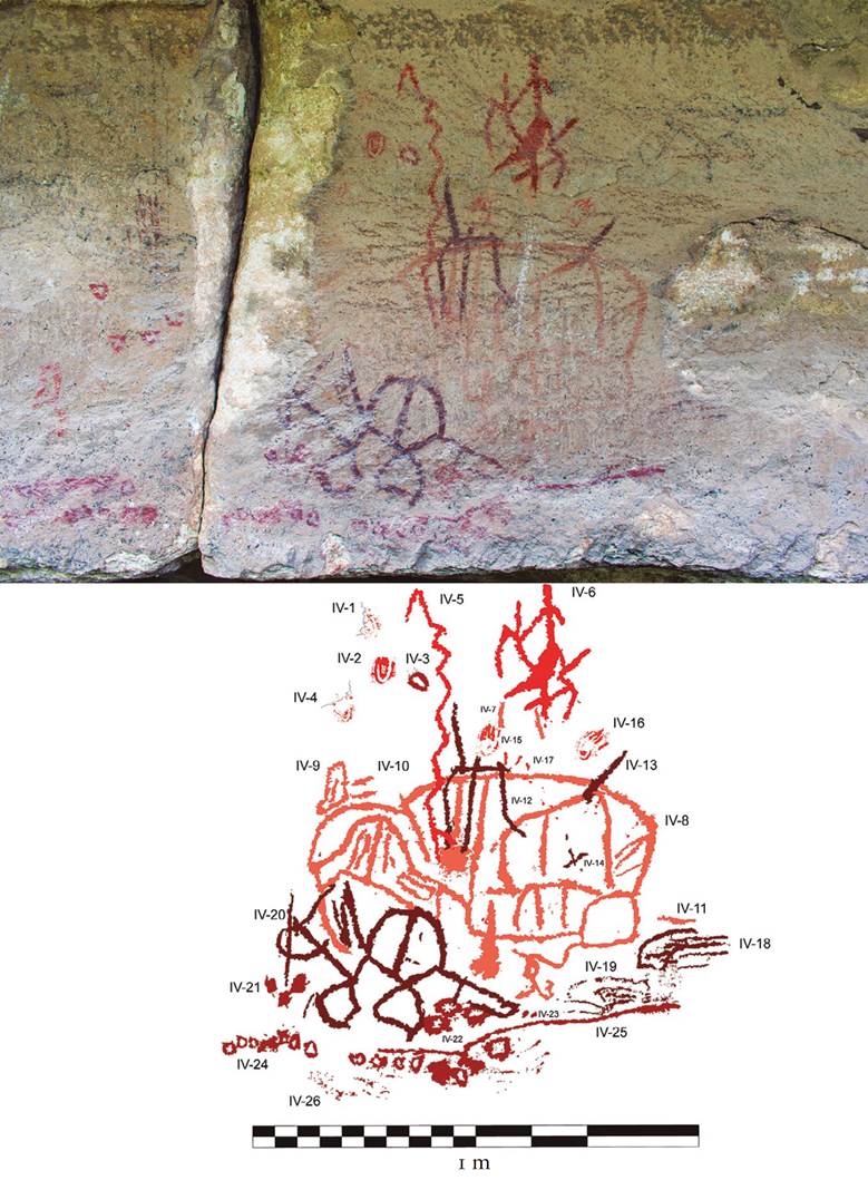 6 Composición polícroma del panel IV de Cueva de Galindo, Cañón de Molino. Foto y dibujo: Daniel Herrera Maldonado.
