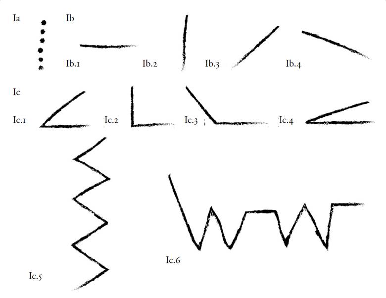 9 Formas elementales en la pintura. (Ia) el punto y (Ib) la línea. Líneas rectas: (Ib.1) horizontal; (Ib.2) vertical; (Ib.3) diagonal y (Ib.4) libre; (Ic) quebradas simples: (Ic.1) con ángulo agudo; (Ic.2) con ángulo recto; (Ic.3) con ángulo obtuso; (Ic.4) con ángulo libre; (Ic.5) quebrada compleja zigzagueante y (Ic.6) quebrada compleja. Dibujos: Daniel Herrera Maldonado.