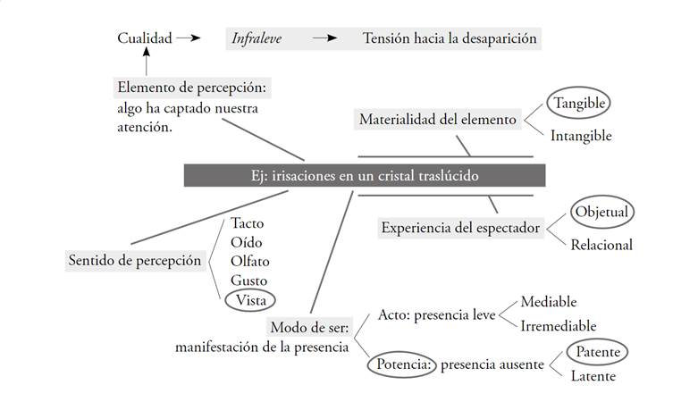 Por un lado, lo infraleve en acto es ya una ausencia, es decir, se expresa a partir de los restos de lo que era. Se trata de una presencia que se denota por su ausencia, mediante sus restos, y a esto lo denominaremos presencia ausente. Por otro lado, lo infraleve en potencia es aquello que se sitúa en proceso hacia su desaparición (o plenitud), ya sea de manera mediable o irremediable, y engloba todo elemento o transición y naturaleza frágil, liviana o mensurablemente pequeña. A esto lo denominaremos presencia leve.